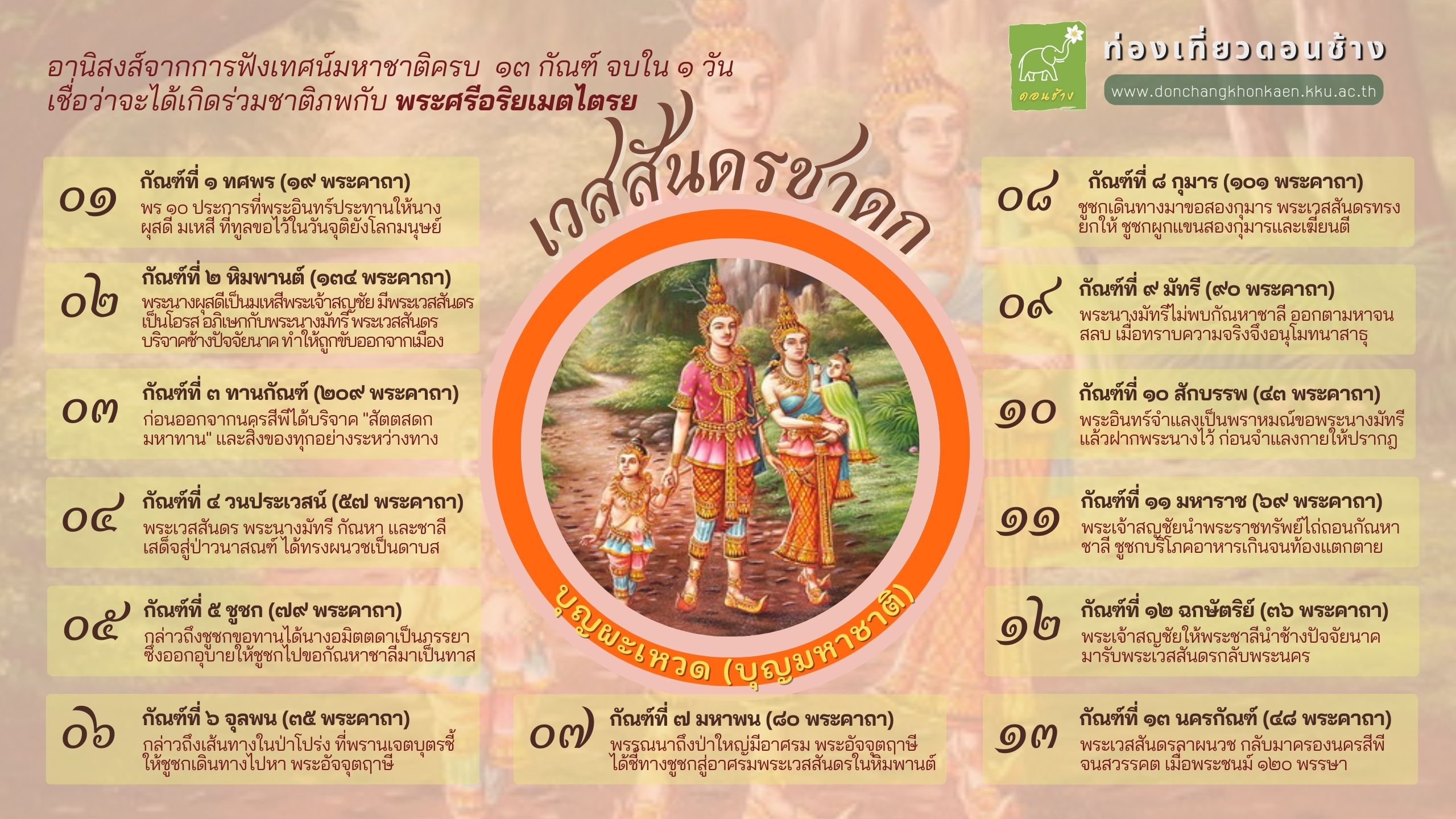 พระเวสสันดรชาดก เป็นการบริจาคทานครั้งยิ่งใหญ่ในชาดกพระชาติสุดท้ายของพระพุทธเจ้า การฟังเทศน์มหาชาติเชื่อว่าทำให้ผู้ฟังได้บุญมาก โดยเชื่อกันว่าหากได้ฟังเทศน์มหาชาติครบ ๑๓ กัณฑ์ จบใน ๑ วัน มีอานิสงค์มากจะได้เกิดร่วมชาติภพกับพระศรีอริยเมตไตรย