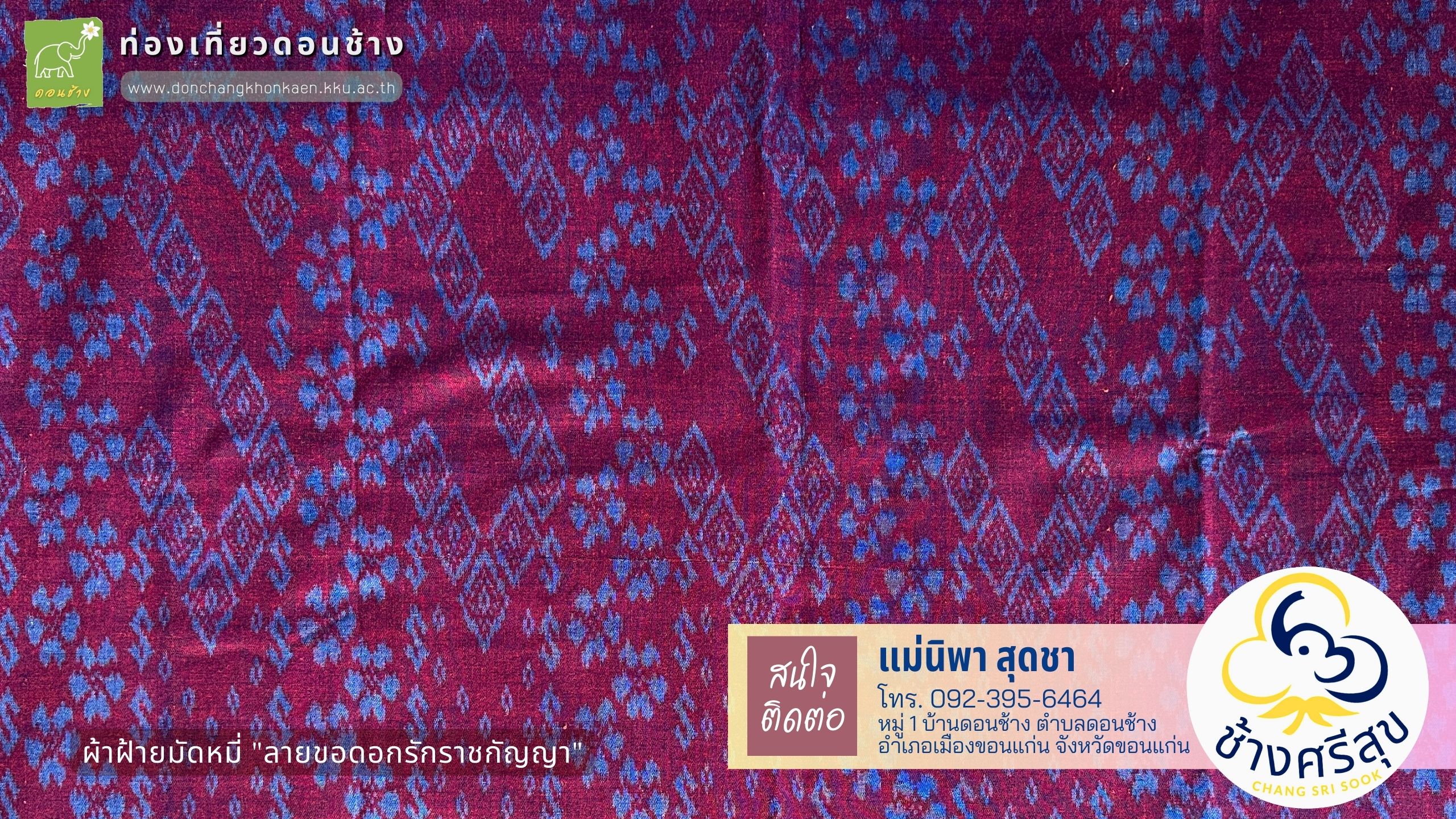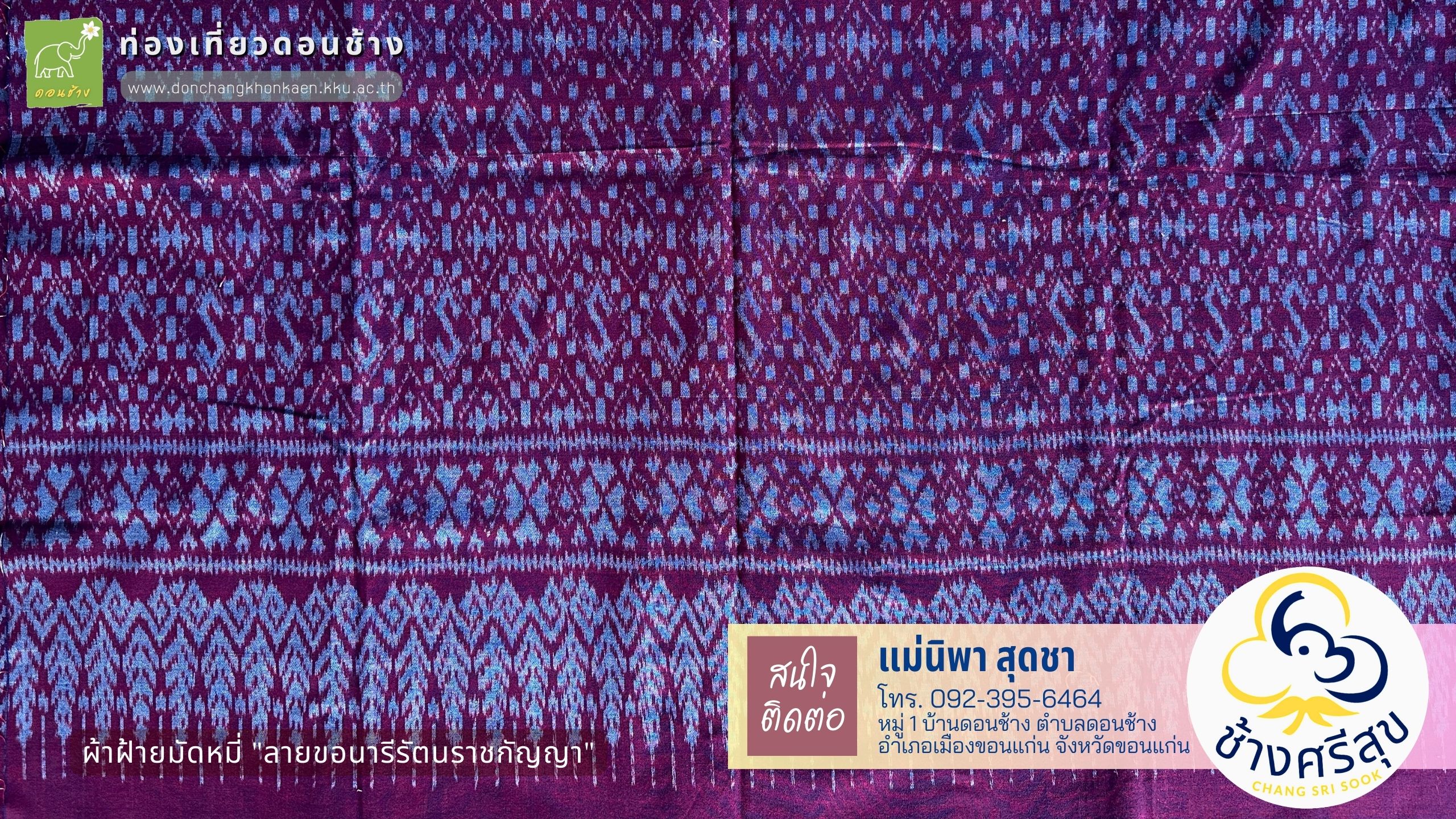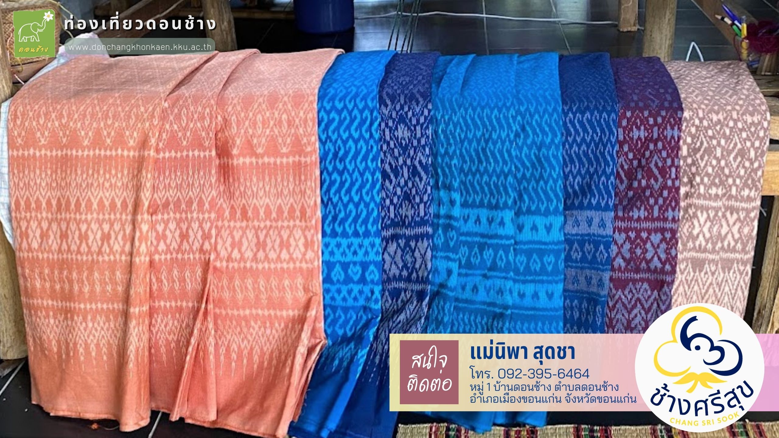 กลุ่มทอผ้าฝ้ายบ้านดอนช้าง เป็นการรวมกลุ่มผู้สูงวัยในชุมชนตั้งแต่ปี ๒๕๕๗ มาใช้เวลาว่างร่วมกันทำกิจกรรมเพื่อสุขภาพ ส่งเสริมสมาธิ และเสริมรายได้ ณ “โฮงต่ำหูก” สืบสานไว้ให้ลูกหลานเบิ่ง สนใจให้การสนับสนุนผลิตภัณฑ์ชุมชน “ช้างศรีสุข” หรือต้องการศึกษาเรียนรู้การทำงานของกลุ่มทอผ้าฝ้ายติดต่อได้ที่ แม่นิพา สุดชา โทร. ๐๙๒-๓๙๕-๖๔๖๔ หรือ เลขที่ ๒๘๕ หมู่ ๑ บ้านดอนช้าง อำเภอเมือง จังหวัดขอนแก่น