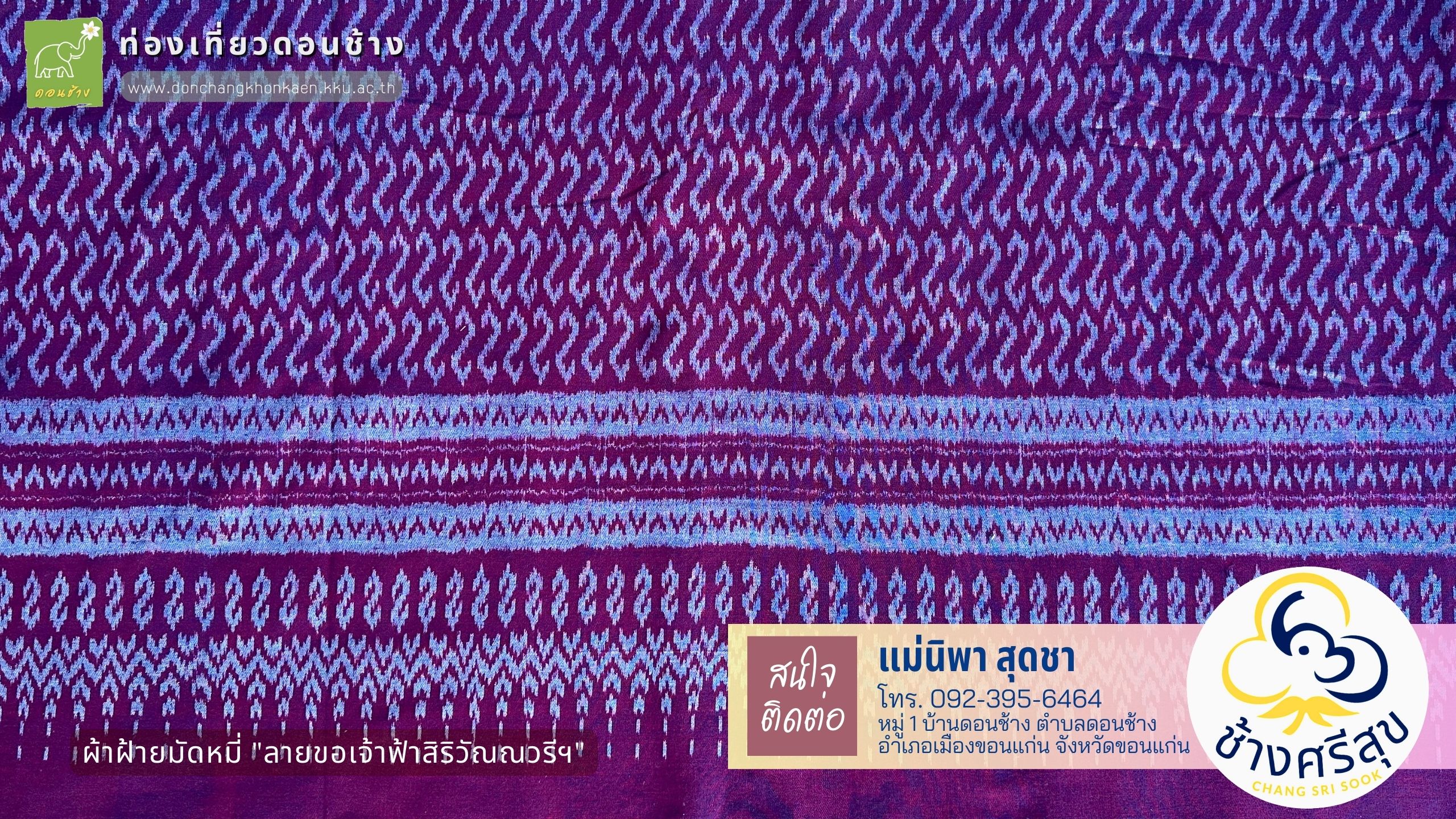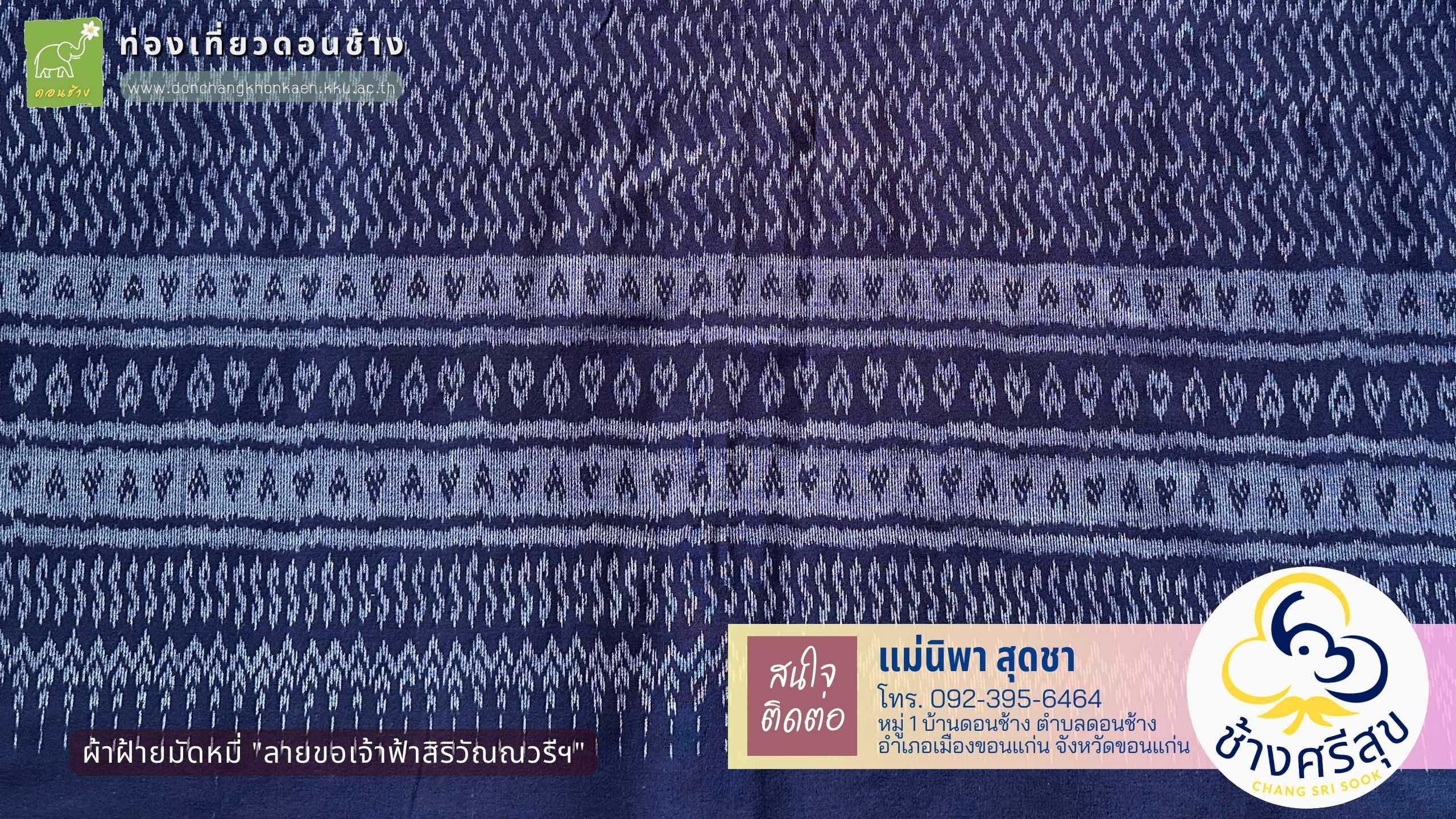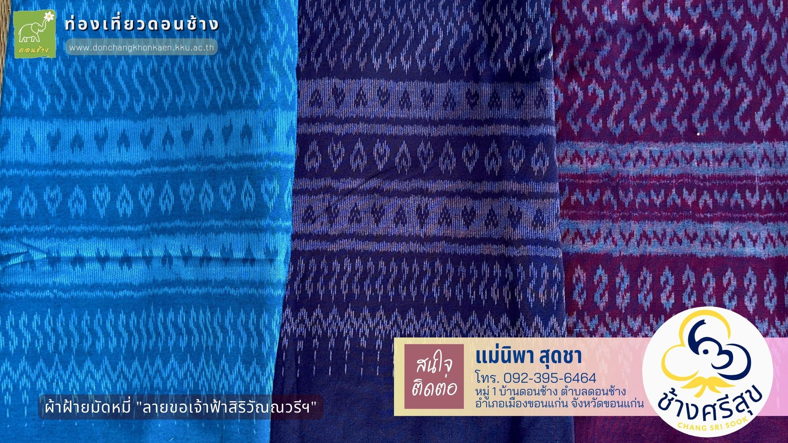 กลุ่มทอผ้าฝ้ายบ้านดอนช้าง เป็นการรวมกลุ่มผู้สูงวัยในชุมชนตั้งแต่ปี ๒๕๕๗ มาใช้เวลาว่างร่วมกันทำกิจกรรมเพื่อสุขภาพ ส่งเสริมสมาธิ และเสริมรายได้ ณ “โฮงต่ำหูก” สืบสานไว้ให้ลูกหลานเบิ่ง สนใจให้การสนับสนุนผลิตภัณฑ์ชุมชน “ช้างศรีสุข” หรือต้องการศึกษาเรียนรู้การทำงานของกลุ่มทอผ้าฝ้ายติดต่อได้ที่ แม่นิพา สุดชา โทร. ๐๙๒-๓๙๕-๖๔๖๔ หรือ เลขที่ ๒๘๕ หมู่ ๑ บ้านดอนช้าง อำเภอเมือง จังหวัดขอนแก่น