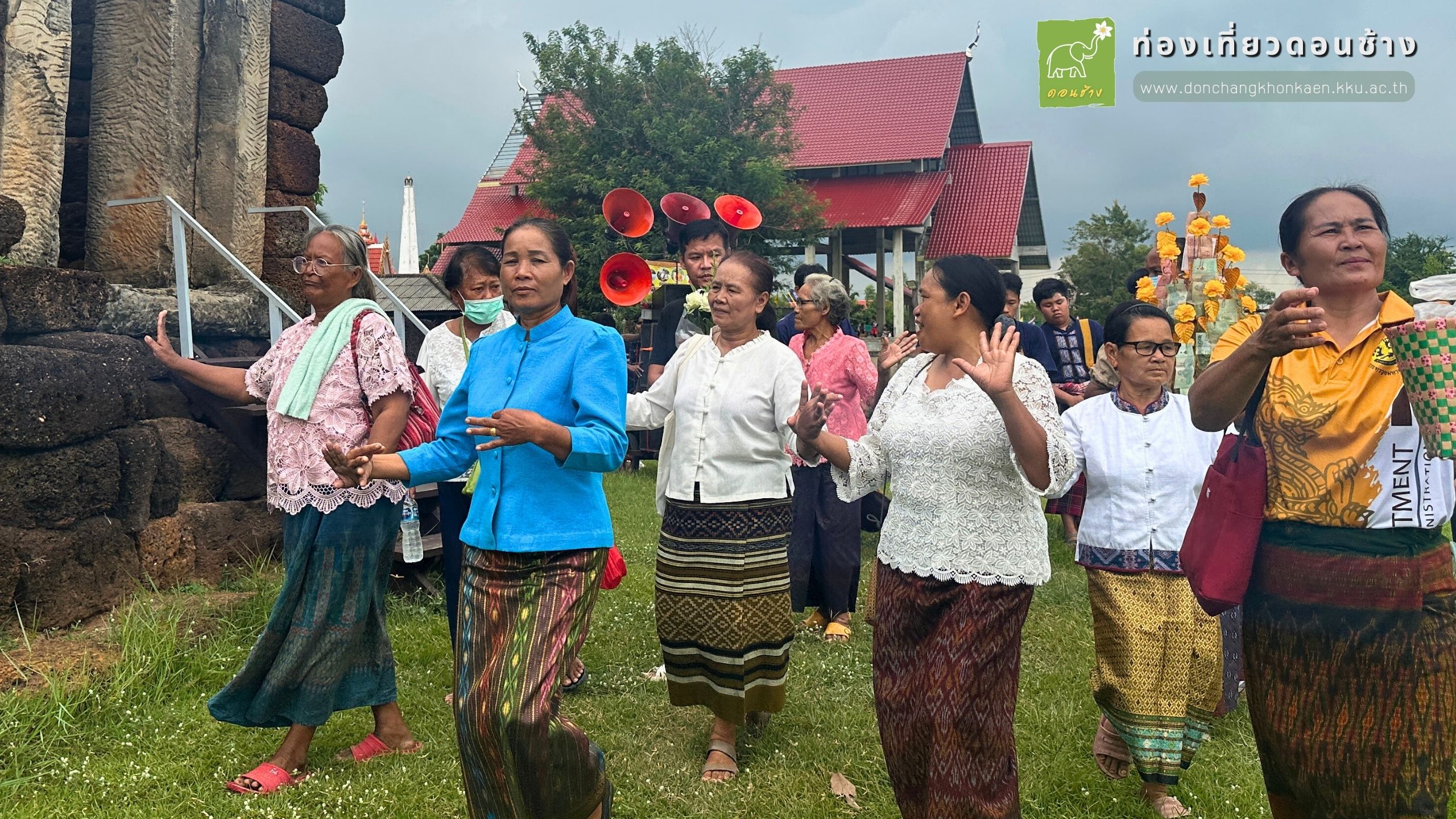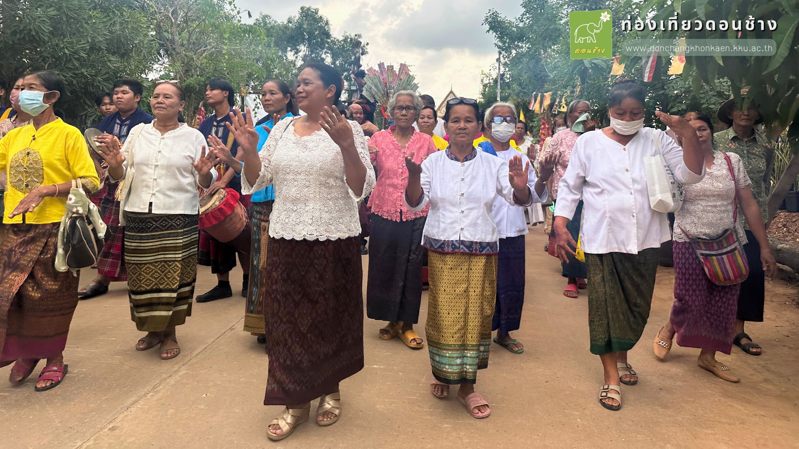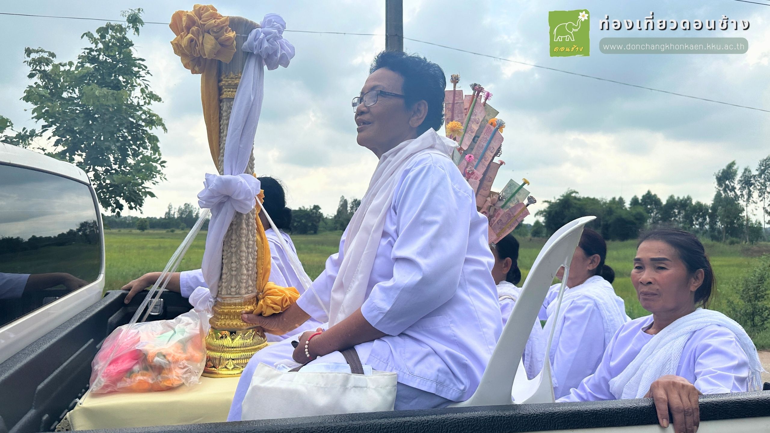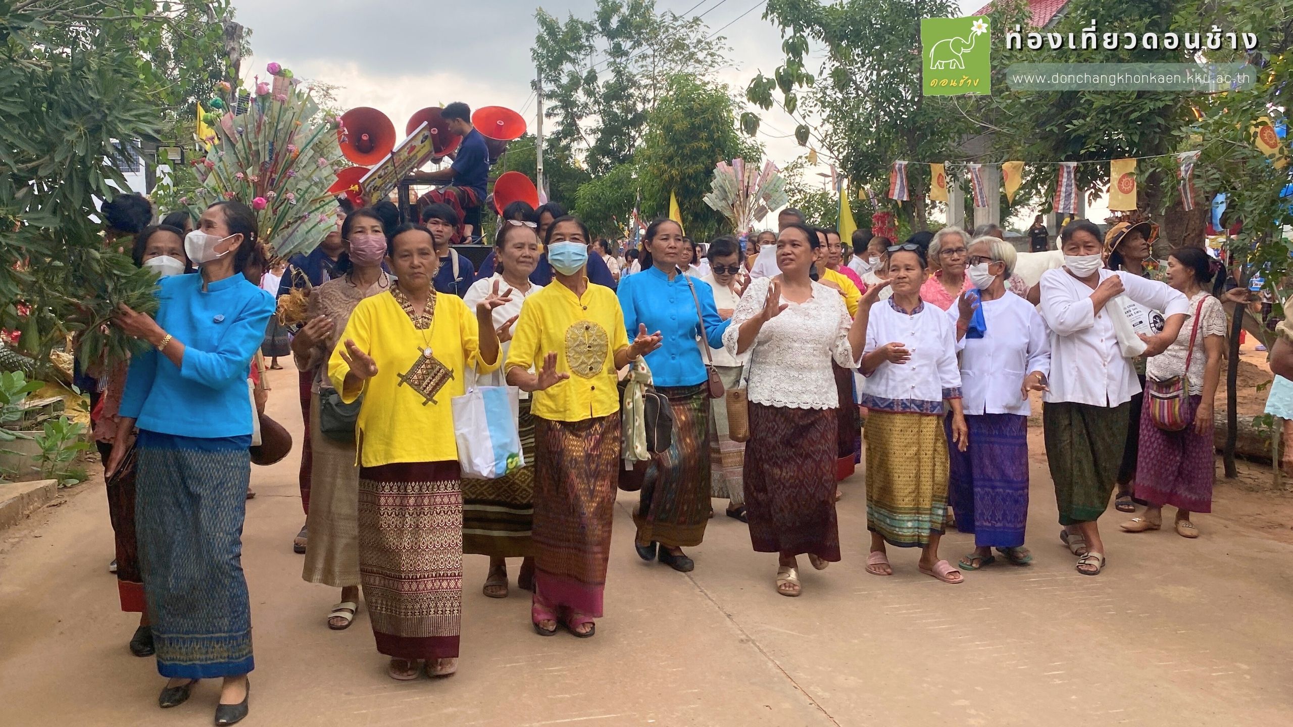 ขบวนแห่กลองยาวและผู้มีจิตศรัทธาทั้งหลายที่ทยอยเดินทางมาสมทบ ได้มารวมตัวกันทำพิธีถวายเทียนพรรษาและผ้าอาบน้ำฝนที่ศาลาธรรมสังเวช ซึ่งคณะสงฆ์ในตำบลดอนช้างจำนวน ๓๐ รูปมารออยู่พร้อมแล้ว โดยมี หลวงพ่อพระครูสิริสารวุฒิคุณ เจ้าอาวาสวัดวุฒาราม จังหวัดขอนแก่น และเจ้าคณะอำเภอเมืองขอนแก่น เป็นประธานฝ่ายสงฆ์ และ จ่าสิบเอกนพดล คนตรง นายกองค์การบริหารส่วนตำบลดอนช้าง เป็นประธานฝ่ายฆราวาส พร้อมด้วยกำนัน ผู้ใหญ่บ้านทั้ง ๘ หมู่บ้าน และผู้นำชุมชนต่างๆ ของตำบลดอนช้างเข้าร่วมในพิธี