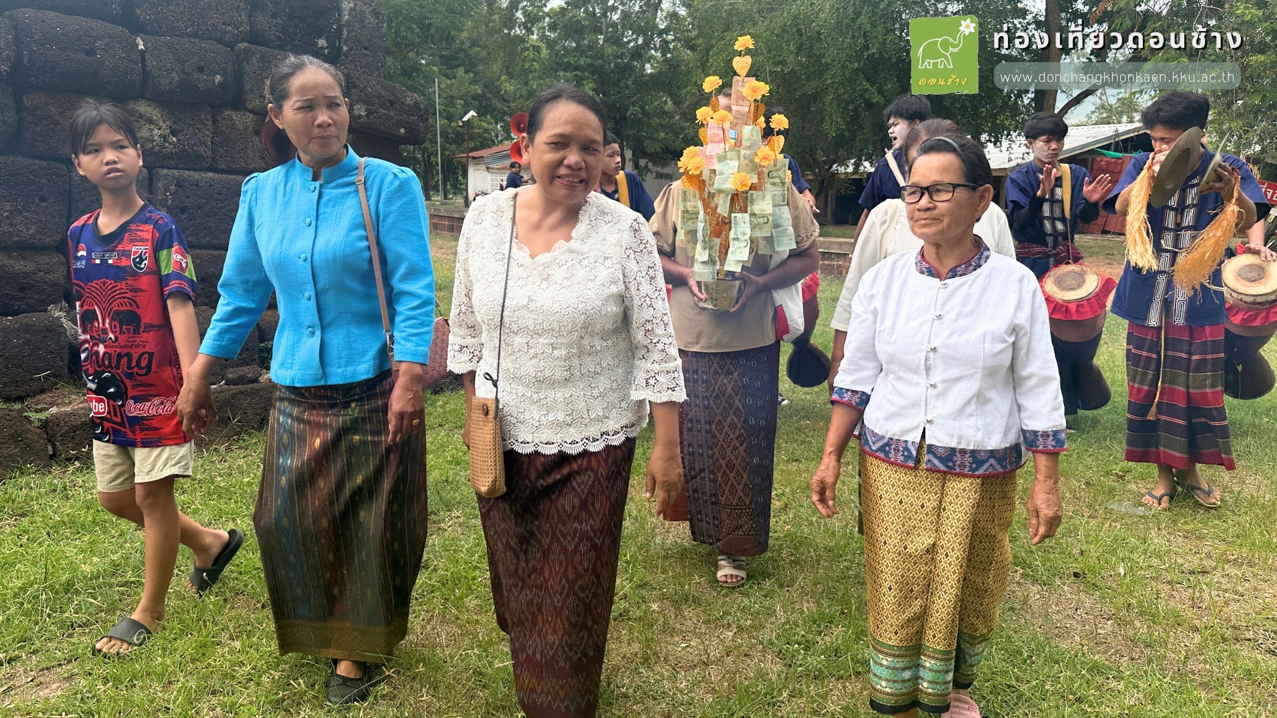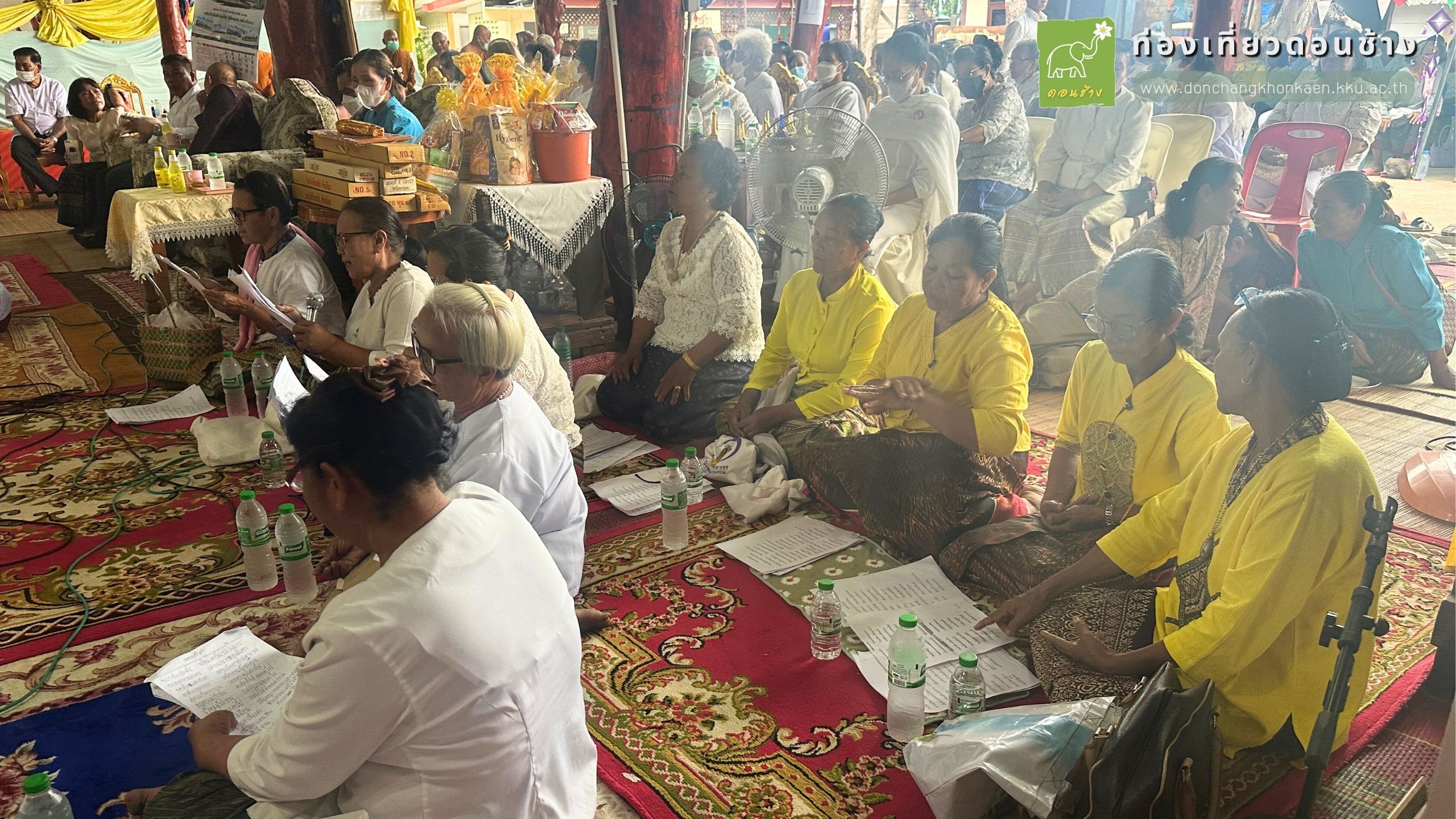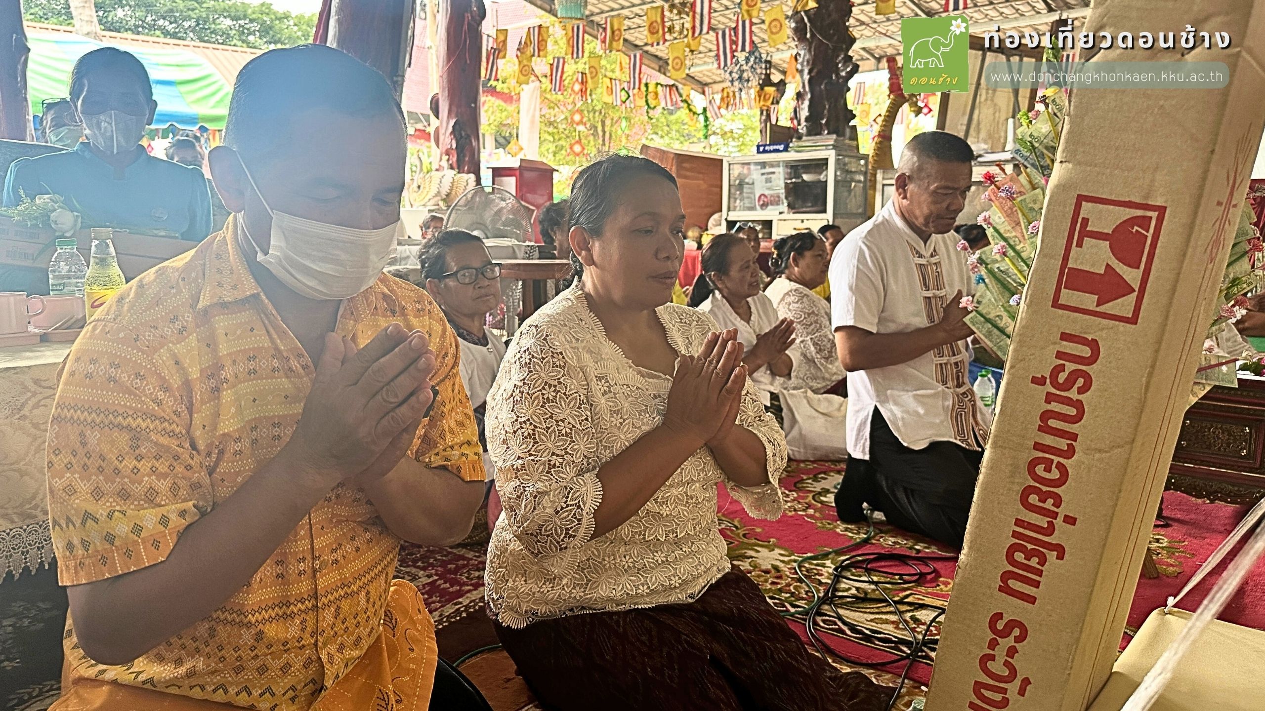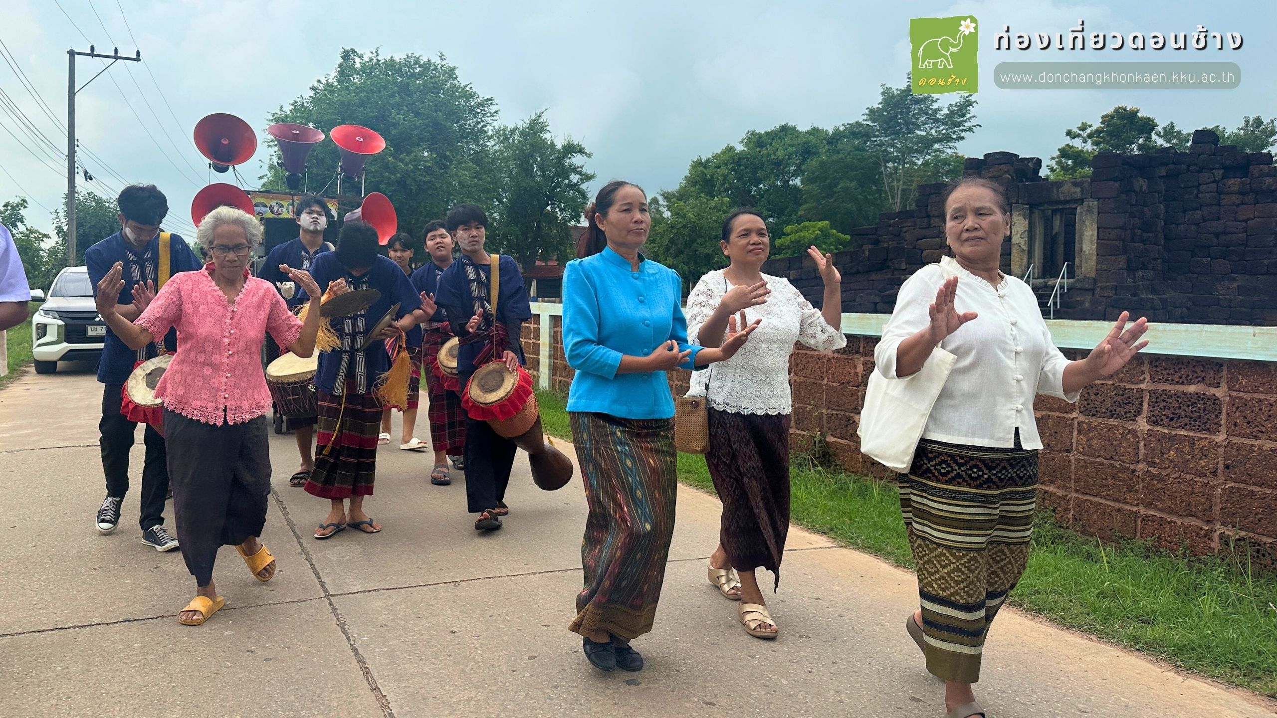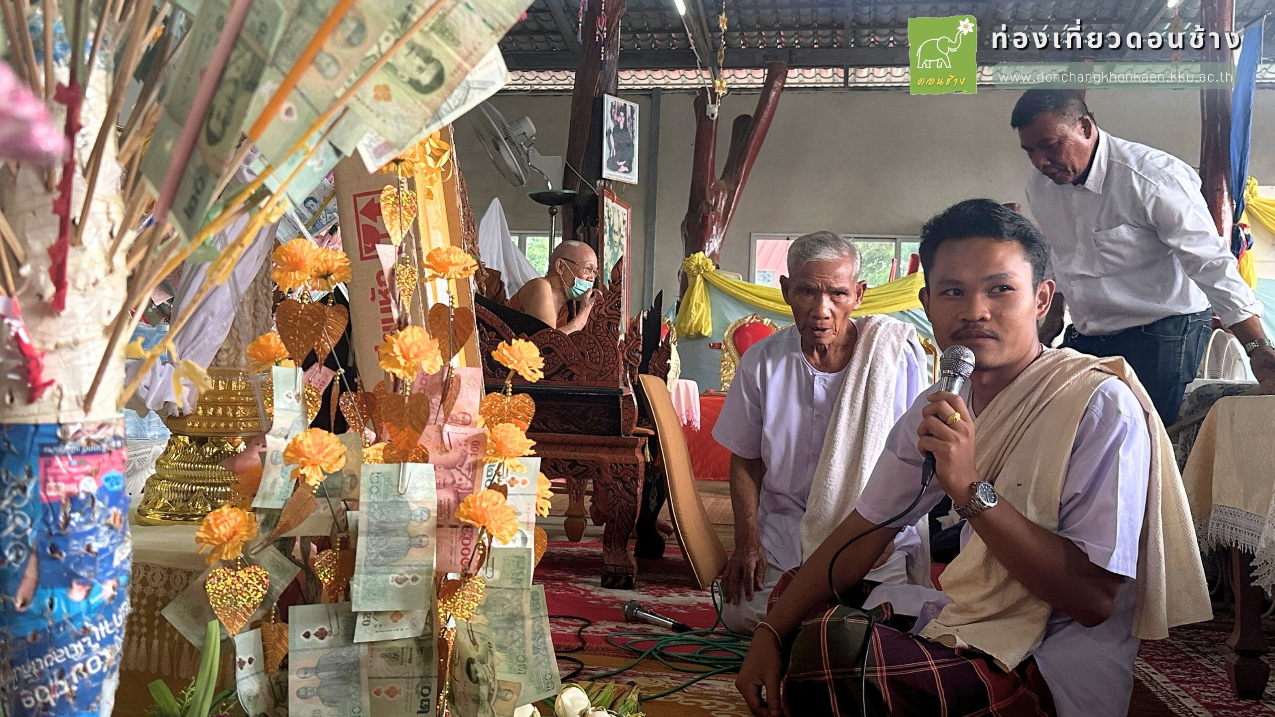 ขบวนแห่กลองยาวและผู้มีจิตศรัทธาทั้งหลายที่ทยอยเดินทางมาสมทบ ได้มารวมตัวกันทำพิธีถวายเทียนพรรษาและผ้าอาบน้ำฝนที่ศาลาธรรมสังเวช ซึ่งคณะสงฆ์ในตำบลดอนช้างจำนวน ๓๐ รูปมารออยู่พร้อมแล้ว โดยมี หลวงพ่อพระครูสิริสารวุฒิคุณ เจ้าอาวาสวัดวุฒาราม จังหวัดขอนแก่น และเจ้าคณะอำเภอเมืองขอนแก่น เป็นประธานฝ่ายสงฆ์ และ จ่าสิบเอกนพดล คนตรง นายกองค์การบริหารส่วนตำบลดอนช้าง เป็นประธานฝ่ายฆราวาส พร้อมด้วยกำนัน ผู้ใหญ่บ้านทั้ง ๘ หมู่บ้าน และผู้นำชุมชนต่างๆ ของตำบลดอนช้างเข้าร่วมในพิธี