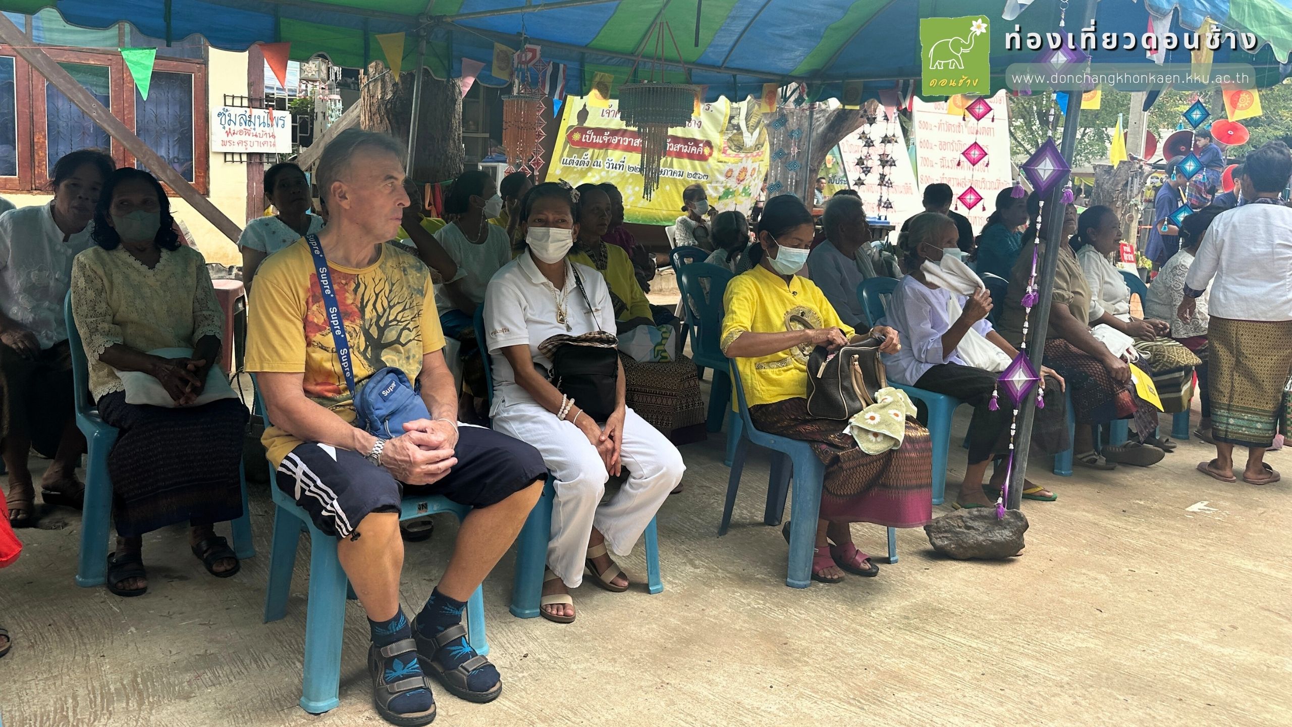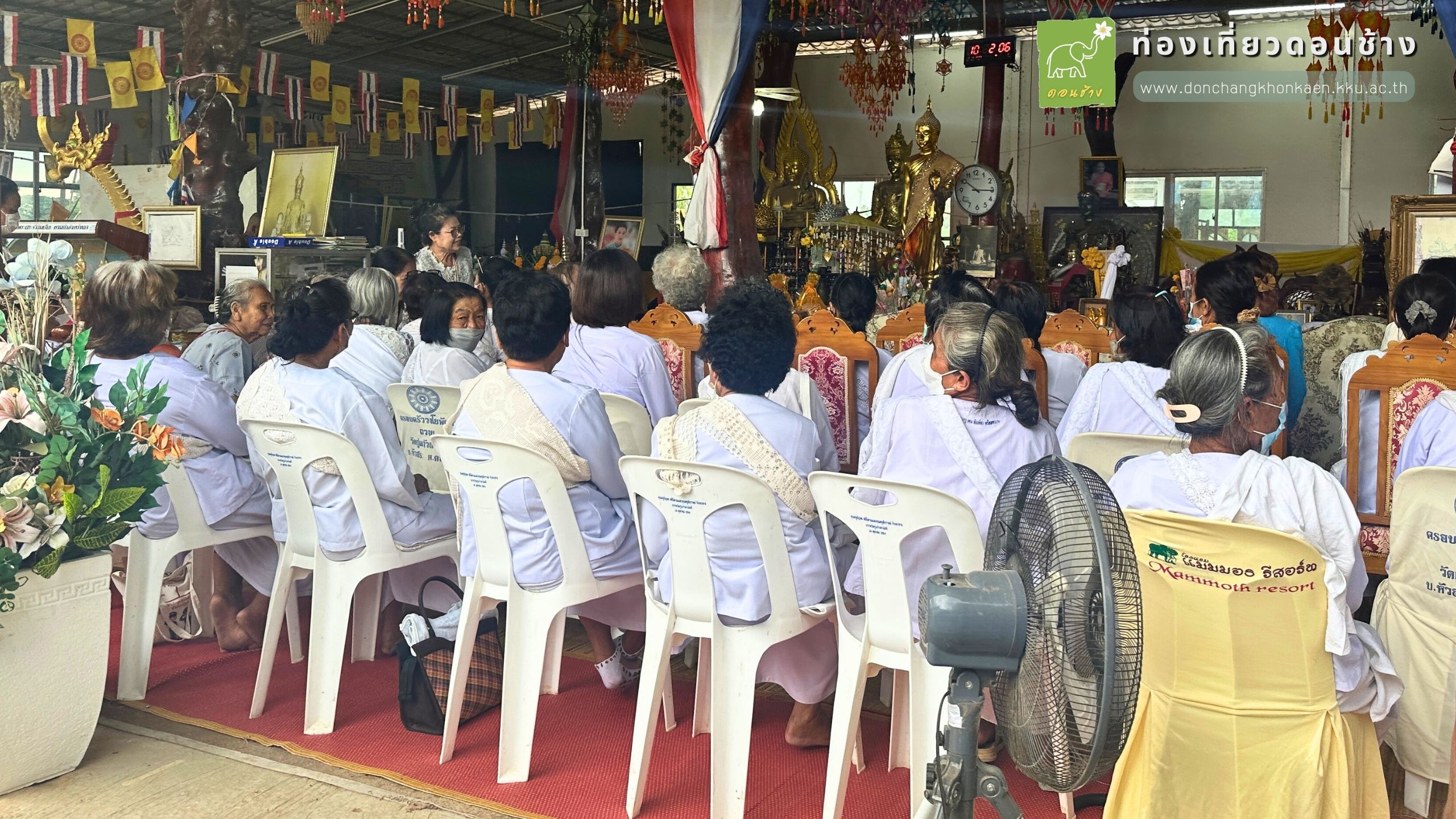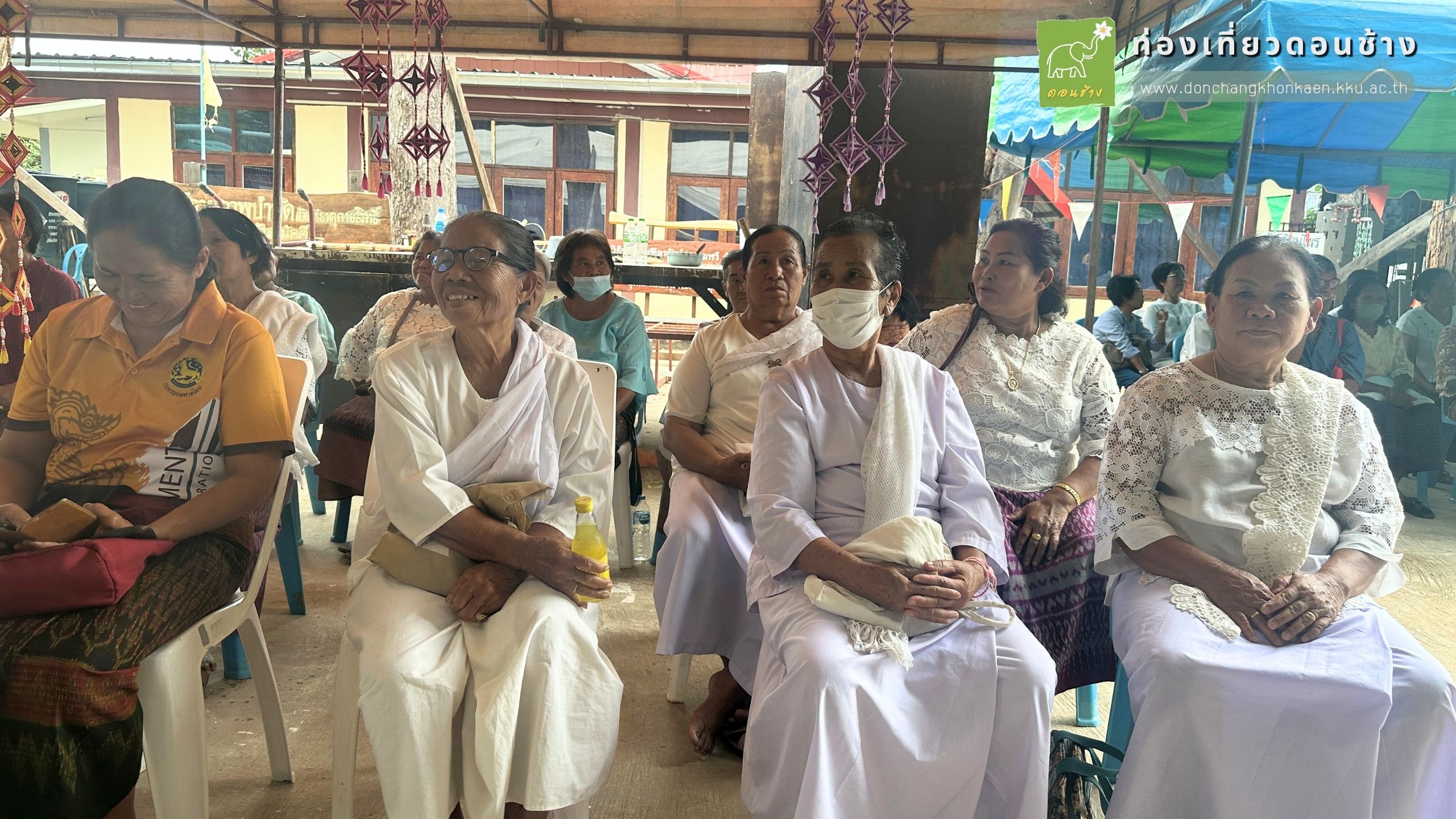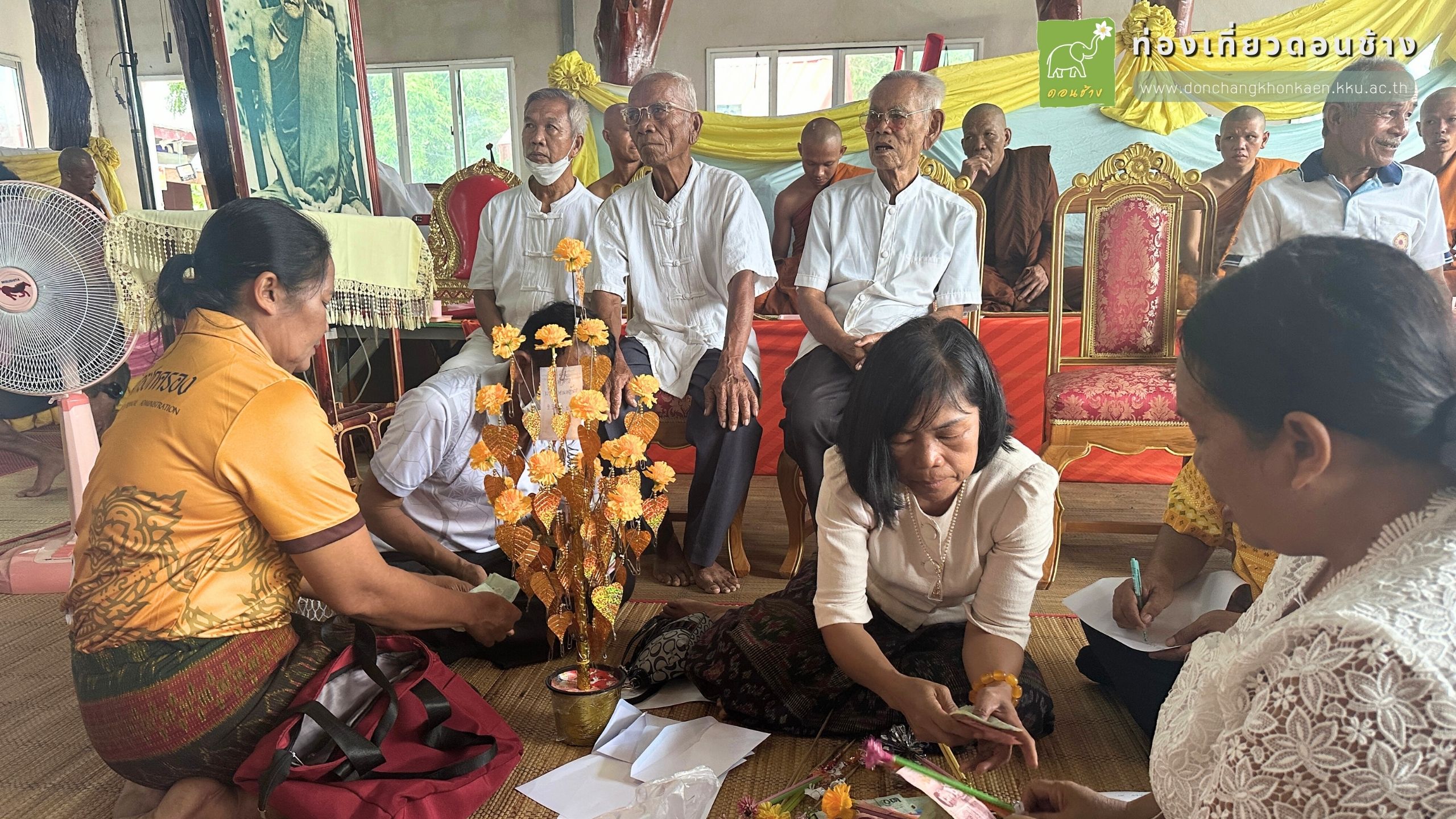 ขบวนแห่กลองยาวและผู้มีจิตศรัทธาทั้งหลายที่ทยอยเดินทางมาสมทบ ได้มารวมตัวกันทำพิธีถวายเทียนพรรษาและผ้าอาบน้ำฝนที่ศาลาธรรมสังเวช ซึ่งคณะสงฆ์ในตำบลดอนช้างจำนวน ๓๐ รูปมารออยู่พร้อมแล้ว โดยมี หลวงพ่อพระครูสิริสารวุฒิคุณ เจ้าอาวาสวัดวุฒาราม จังหวัดขอนแก่น และเจ้าคณะอำเภอเมืองขอนแก่น เป็นประธานฝ่ายสงฆ์ และ จ่าสิบเอกนพดล คนตรง นายกองค์การบริหารส่วนตำบลดอนช้าง เป็นประธานฝ่ายฆราวาส พร้อมด้วยกำนัน ผู้ใหญ่บ้านทั้ง ๘ หมู่บ้าน และผู้นำชุมชนต่างๆ ของตำบลดอนช้างเข้าร่วมในพิธี